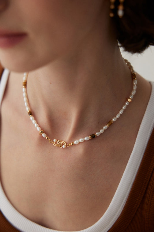 珍珠虎眼石复古项链,宛如一位优雅的古典美人,在时光的长河中款款走来。银白色的珍珠串成优雅的项链,每一颗都散发着温润的光泽,仿佛蕴含着深海的秘密。